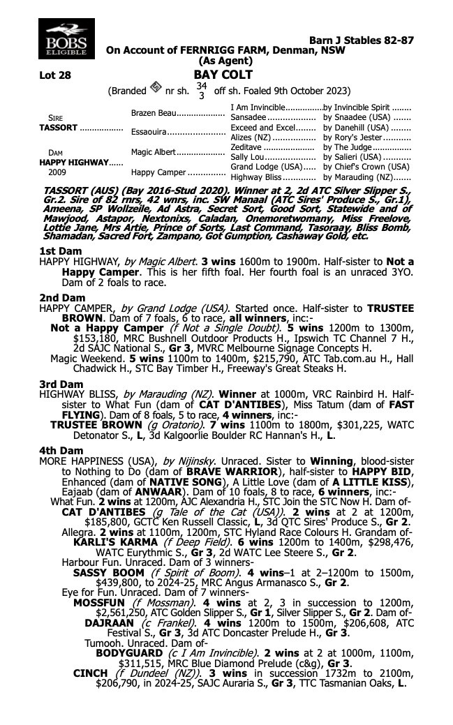 Tassort is a son of Brazen Beau and out of one of Australia’s great blue hen mares Essaouira, and from the dominant I Am Invincible sire line.